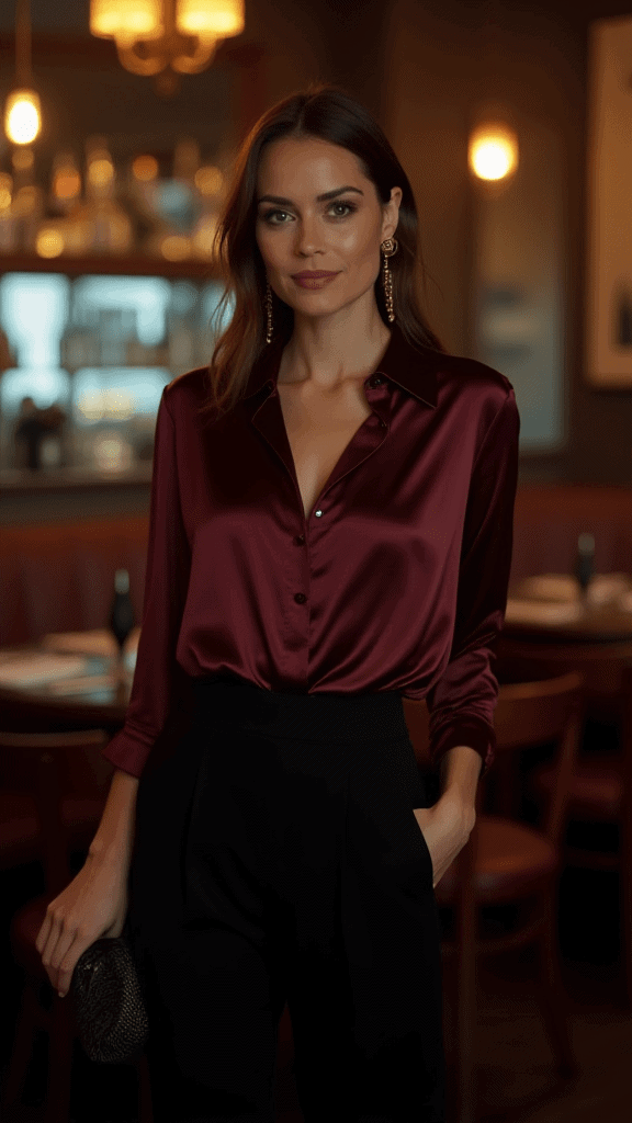 A silk blouse with wide-leg trousers creates a classy and elegant dinner outfit. It works well for more formal settings while staying comfortable and easy to move in.