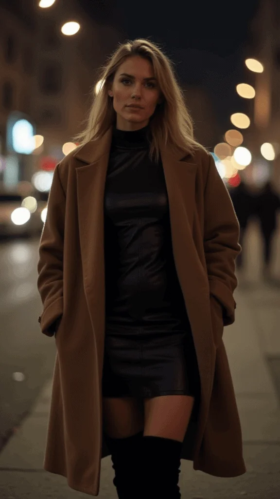 A leather mini dress paired with thigh-high boots creates a strong and confident winter outfit. It’s bold, stylish, and made to stand out.