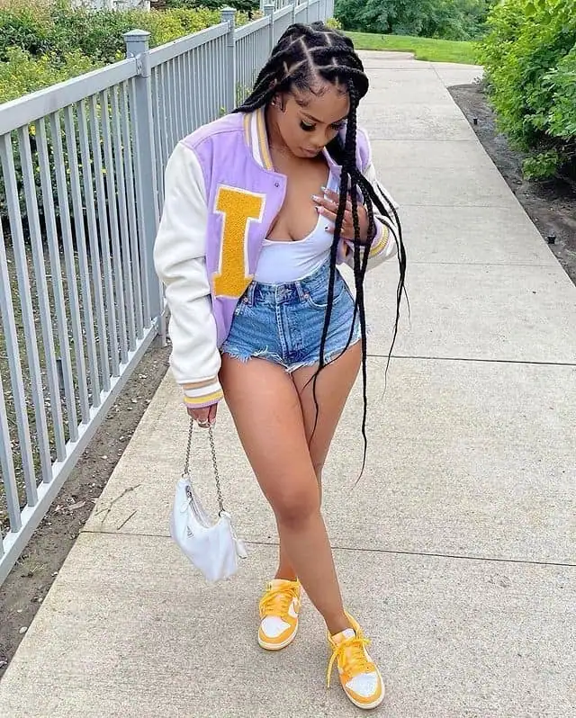 Denim shorts and a fitted bodysuit balance the relaxed jacket, making the outfit flattering and easy to wear. Bright sneakers pull the look together and keep it comfortable.