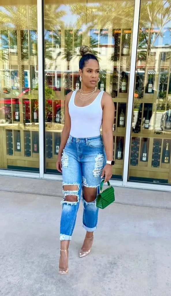 This outfit focuses on simple pieces with bold details. A white tank top keeps things clean while distressed jeans add a carefree vacation feel.