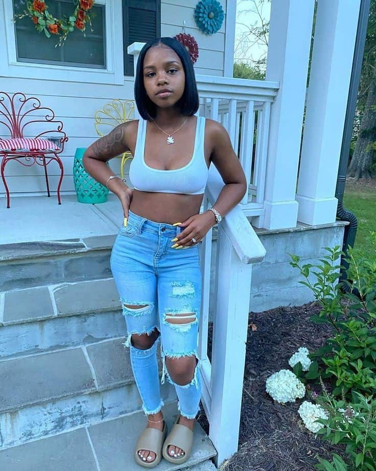 This outfit is simple but effective. A white crop top keeps the look fresh while ripped jeans add texture and edge.