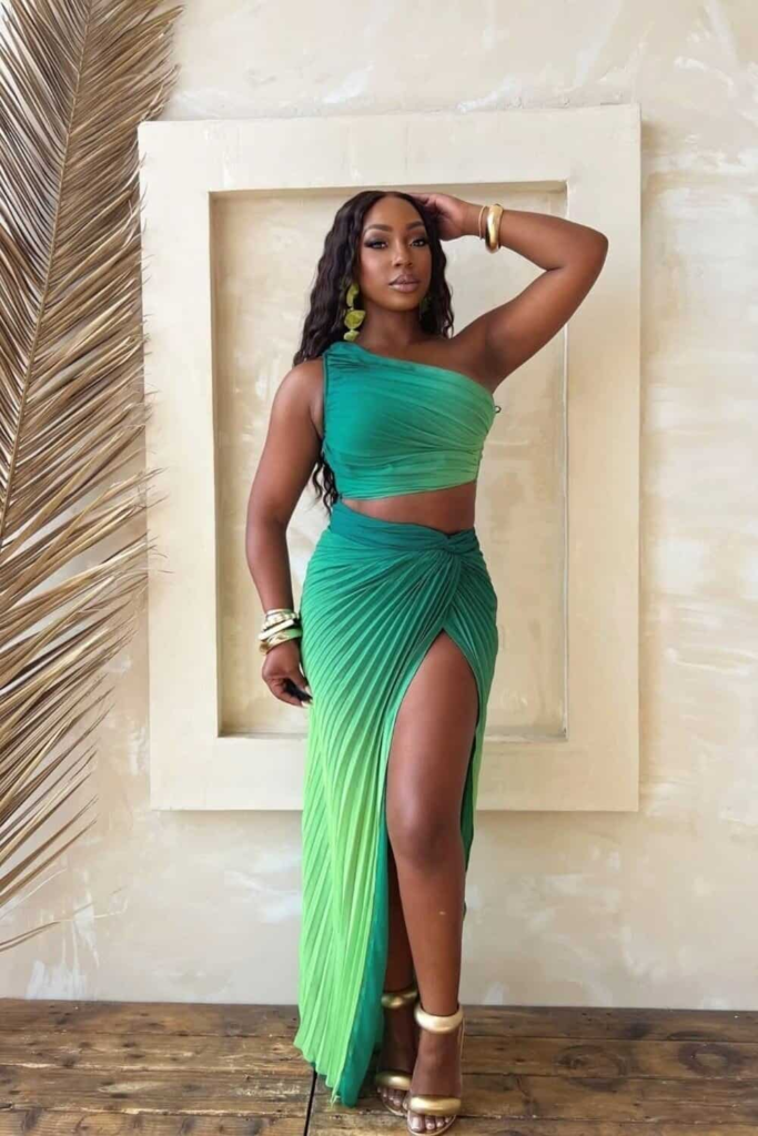 This green set brings strong vacation energy. The one-shoulder top adds interest while the skirt creates movement.