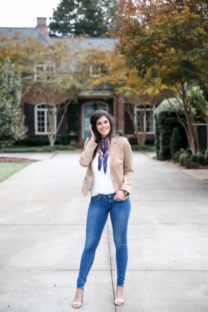This outfit shows how jeans can look clean and professional. A crisp white top paired with a camel blazer creates a neat and structured base. The blue silk scarf adds color and softness without being loud. Well-fitted blue jeans keep the look modern and sharp. Neutral-toned heels finish the outfit and bring everything together. This look proves that a tailored blazer and simple accessories can easily make jeans office-appropriate.