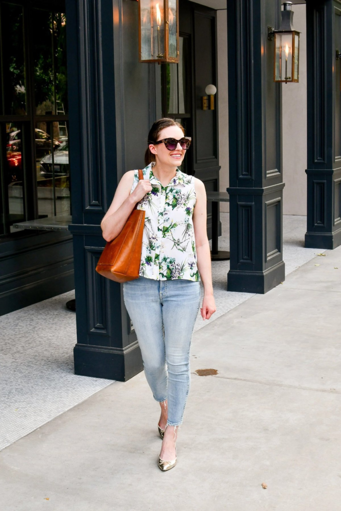 Light wash jeans give this outfit a relaxed feel, while the sleeveless floral blouse adds style and polish. The mix feels fresh and suitable for a business casual workplace. Accessories like a cognac leather tote and metallic pointed flats lift the outfit and make it feel work-ready. Sunglasses add a final polished touch. This look shows how trendy pieces can still work well in a professional setting.