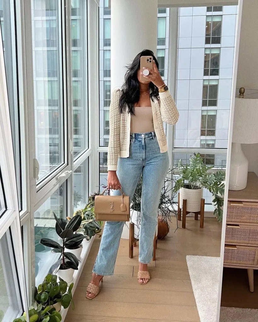 Light-wash straight-leg jeans create a relaxed base, while a cream knit cardigan adds softness and polish. Neutral colors like beige and cream help the outfit feel clean and put together. Simple accessories such as a gold watch and delicate necklace add detail without overdoing it. Paired with understated sandals, this outfit works well for creative offices or casual Fridays.
