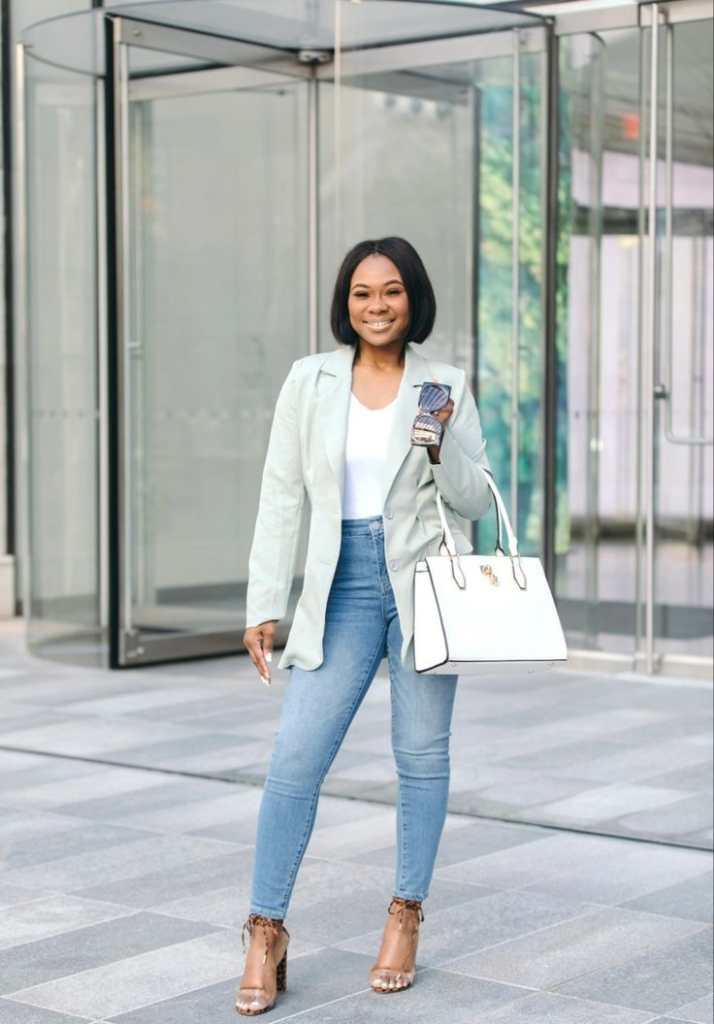 A light-colored blazer adds structure and makes this outfit feel office-ready. High-waisted skinny jeans create a smooth and neat shape. A white top keeps the look fresh and simple. A structured white handbag and nude heeled sandals lift the entire outfit. This combination shows how jeans can fit easily into a polished work look.