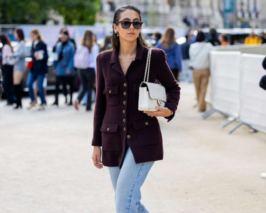 A burgundy blazer adds richness and structure to light-wash jeans. The contrast between the tailored blazer and relaxed denim feels balanced and work-appropriate. Sunglasses and a white handbag add polish. This outfit works well for creative offices or relaxed workdays.