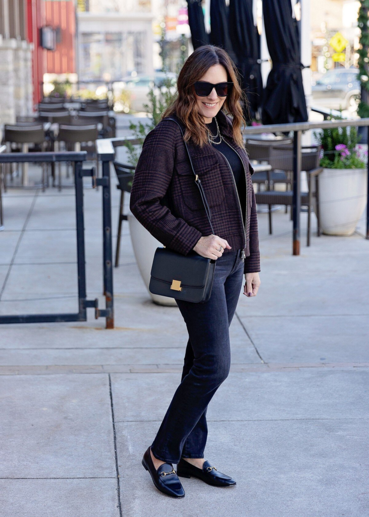 A structured plaid jacket adds texture and warmth to dark wash jeans. A black top keeps the outfit grounded and simple. Leather loafers add a refined touch. Accessories like a black handbag and layered necklaces enhance the overall look. This outfit works well for long workdays and evening plans.