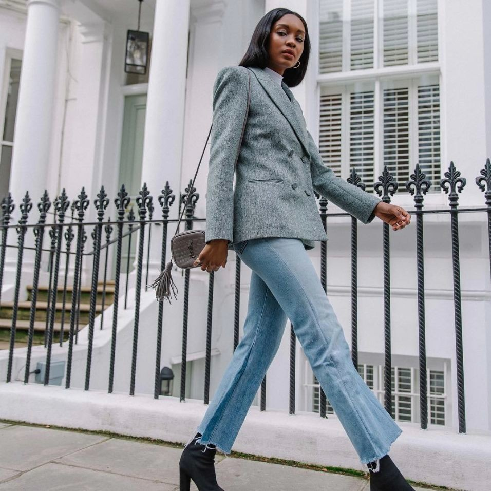 A structured gray blazer adds polish to light wash jeans. The contrast feels modern and fresh. Clean lines keep the outfit professional. A shoulder bag and statement boots complete the look. This outfit works well for long days that move into the evening.
