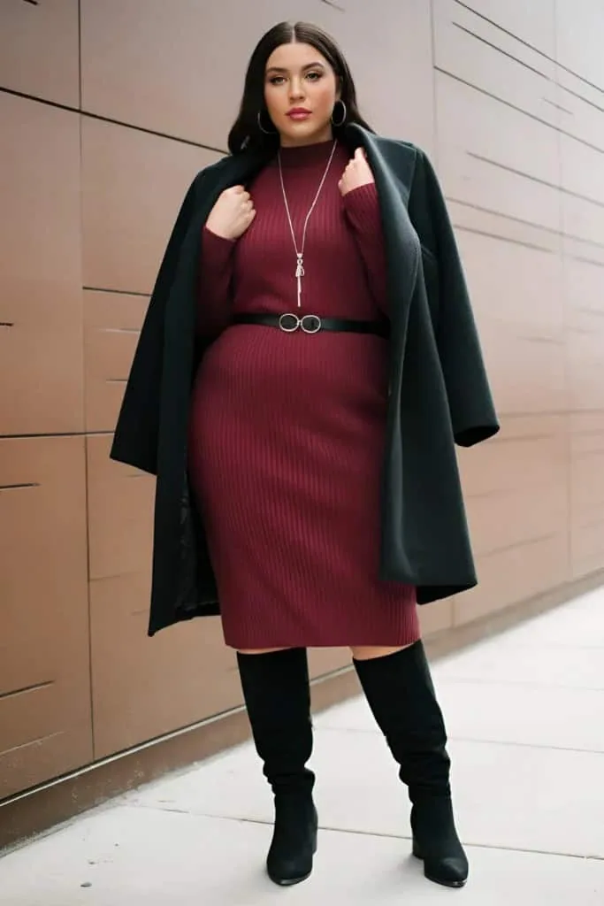 A fitted burgundy sweater dress paired with a black overcoat creates a warm and polished outfit. A thin belt highlights the waist, while a long necklace and hoop earrings add elegance. Knee-high boots complete a look that works from day to evening.