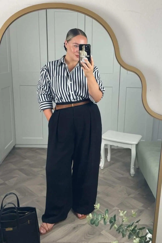 A bold vertical striped shirt creates a lengthening effect when paired with high-waisted wide-leg black trousers. A brown belt defines the waist, while minimalist sandals and a structured tote keep the outfit clean and versatile. This look blends current trends with classic office style.
