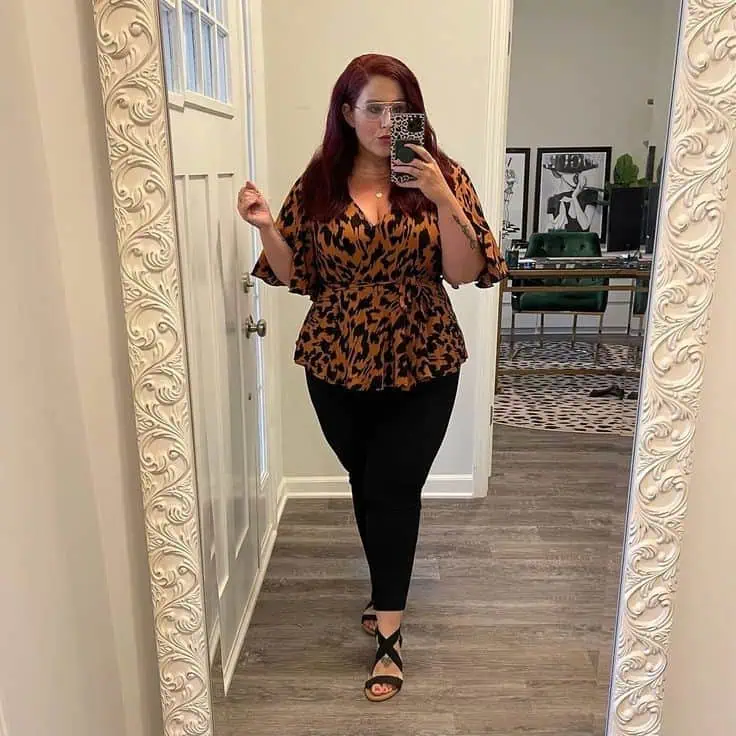 A leopard print peplum top brings personality into the workplace while keeping a professional feel. The cinched waist flatters the figure, and the flared bottom adds comfort. Paired with black pants and strappy sandals, this outfit balances bold style with office-ready polish.