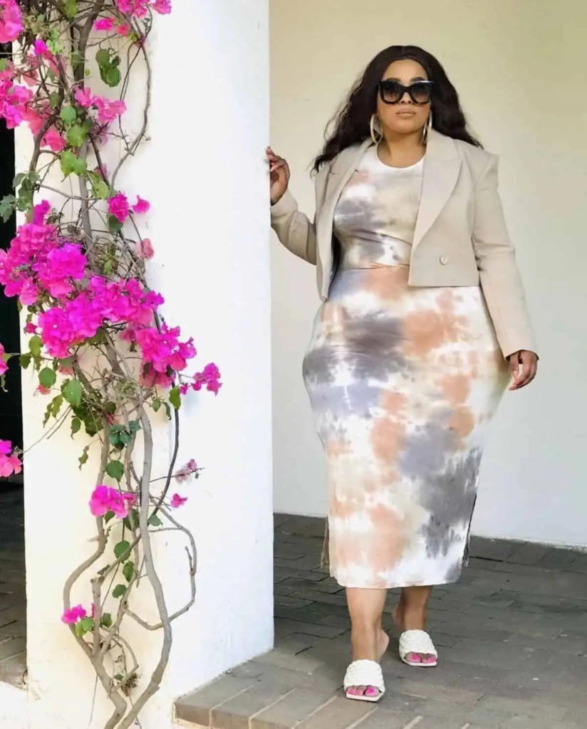 A tie-dye midi dress in soft neutral tones is paired with a cropped beige blazer for structure. The fitted shape flatters curves, and accessories like hoop earrings add style. White slides provide comfort for long workdays while keeping the outfit modern.
