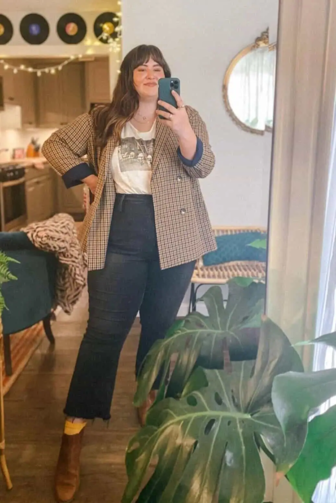 This outfit blends casual and professional elements by pairing a plaid blazer with a graphic tee. Dark wash jeans create a clean shape, and brown ankle boots add seasonal style. It shows how relaxed pieces can still work in a business casual setting.