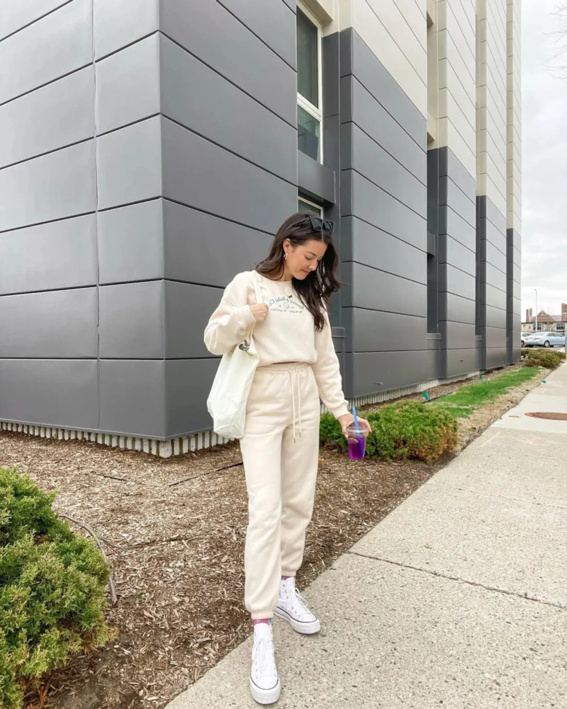 This matching cream sweatsuit is perfect for days when comfort is your main goal. A sweatshirt and joggers in the same color look clean and put-together, even though it feels like you’re wearing something very relaxed.