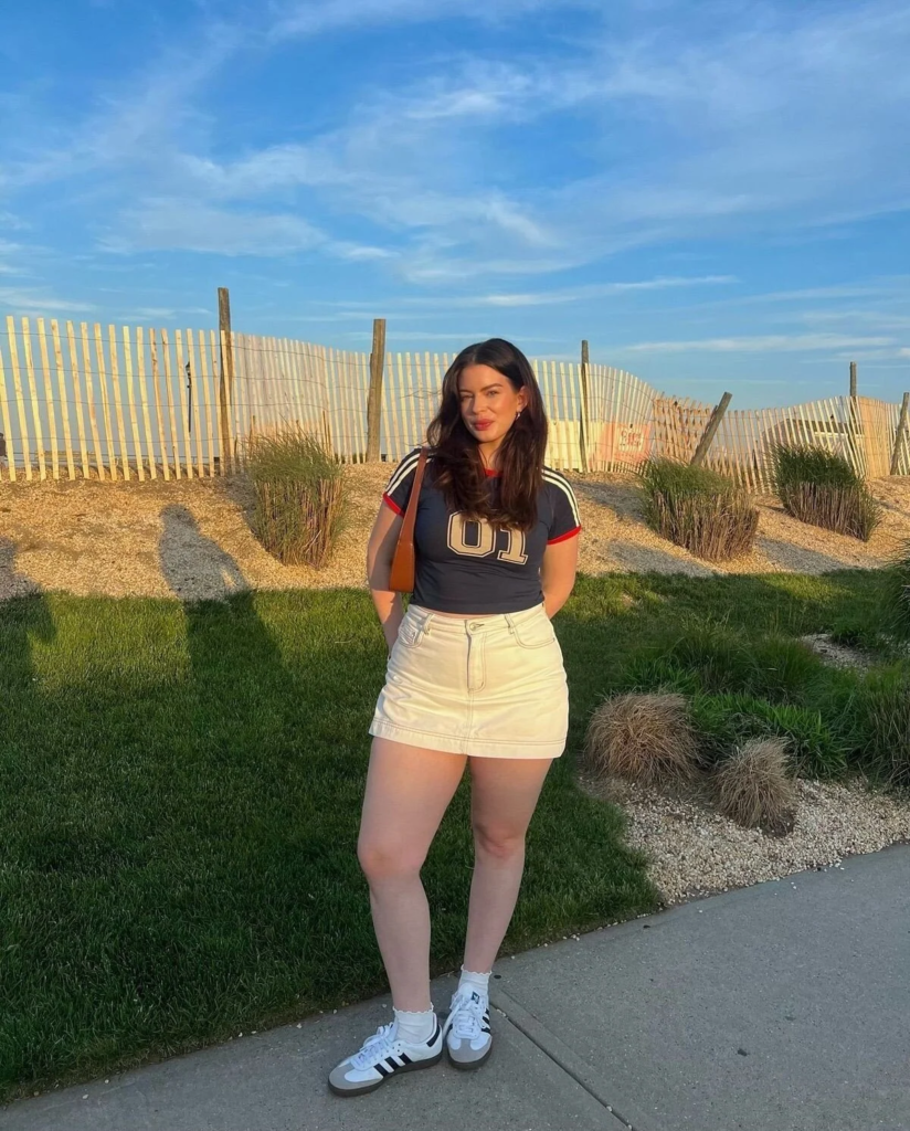A cream denim mini skirt adds a fresh twist and makes the outfit look more stylish than basic shorts or jeans. Sneakers make it easy to move between classes and stay comfortable all day. A simple tote bag is useful for carrying your essentials and keeps the outfit looking easy and school-ready.
