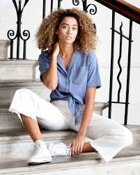 This combination is a favorite of mine when someone wants something chic but still relaxed. A tie-front blouse naturally draws attention to the waist and adds a subtle feminine detail.