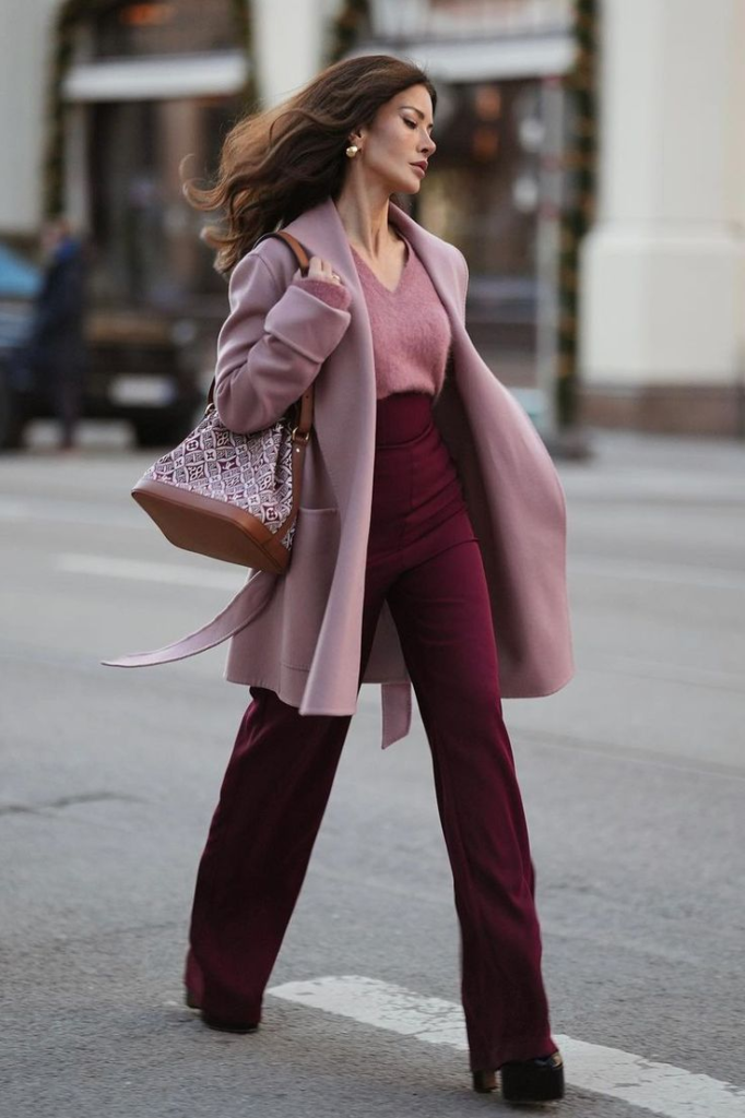 This outfit combines soft and bold colors in a balanced way. A blush pink coat worn over a matching textured sweater creates a warm and romantic base. The softness of the blush tones gives the look a gentle and feminine feel.