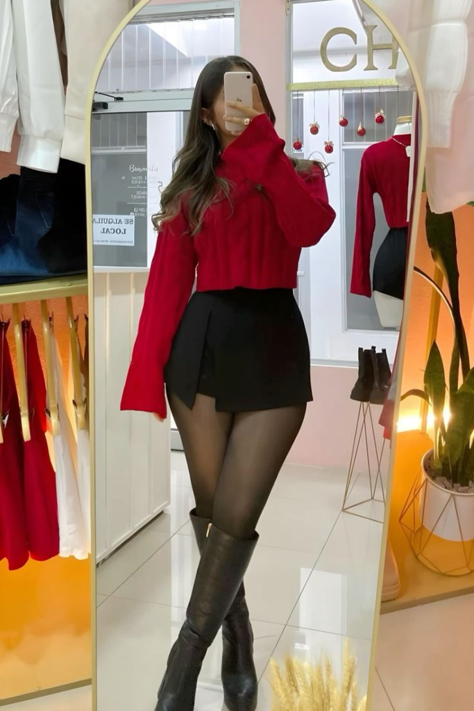 This look mixes warmth and confidence. A cropped red sweater gives the outfit energy and romance. The black mini skirt adds a modern feel with its subtle uneven hem.