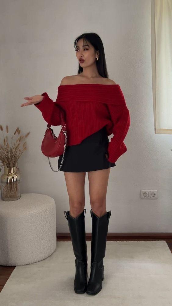 This outfit feels modern and confident. A red off-the-shoulder knit sweater brings warmth and romance. The wide neckline highlights the shoulders and adds charm.