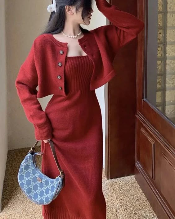 This look focuses on rich red tones. A red knit midi dress with ribbed detail shapes the body softly. A matching cropped cardigan adds warmth and style.