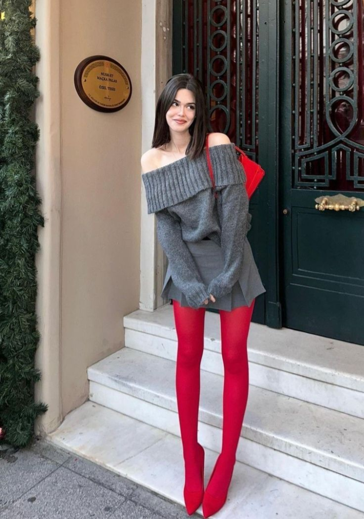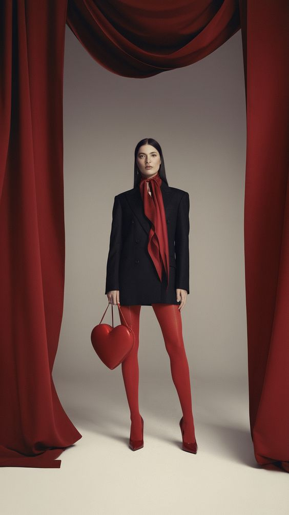 Red tights, red heels, and a small red bag bring Valentine energy. This look works well for a relaxed but stylish outing.