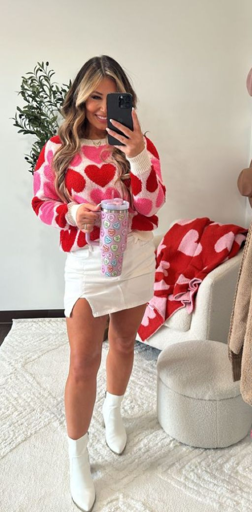 This look is fun and cheerful. A knit sweater covered in red and pink hearts creates a playful mood. A white mini skirt keeps the outfit light.