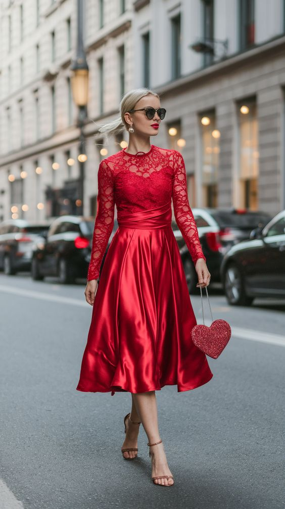 This outfit feels refined and romantic. A red midi dress with a lace bodice and long sleeves adds detail and softness. The satin skirt flows smoothly.