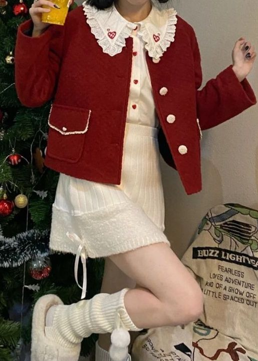 This outfit feels festive and warm. A red jacket with white buttons and a heart-patterned collar adds charm.