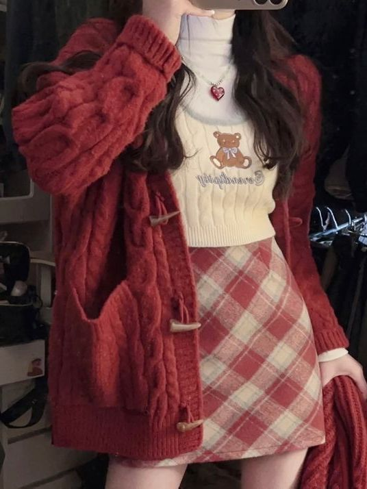 This outfit focuses on warmth and texture. A red cable-knit cardigan feels cozy and inviting. A white turtleneck and knit vest add layers.